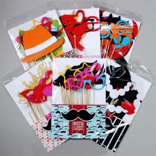 Вырезанные из плотного цветного картона усы, очки, губы и прочие аксессуары позволят вам мгновенно перевоплатиться, создав яркий запоминающийся образ. Готовясь к свадьбе, Дню Рождения, корпоративу или любому другому празднику, не забудьте запастить таким набором. Групповые фотографии от этого только выиграют, так желающих на них присутствовать, равно, как и потом рассматривать, будет максимальное количество.