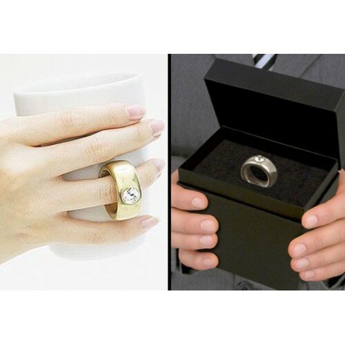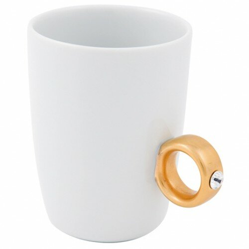 Сегодня мы предлагаем очень необычную кружку. Эта уникальная (действительно уникальная, включённая в коллекцию нью-йоркского Музея Современного Искусства) кружка выполнена из белого фарфора и в качестве ручки имеет золотое или серебряное (в зависимоти от модели) кольцо с крупным бриллиантом (фальшивым)! Надев кольцо ручки на средний палец вы сможете держать кружку, попутно демонстрируя восхищённым окружающим крупное ювелирное украшение со сверкающим бриллиантом! Либо другой вариант. Вы преподносите эту кружку, упакованную в бархатную коробочку (так похожую на упаковку увелирных украшений) вашей любимой или любимому и наслаждаетесь произведённым эффектом. Открыв коробочку, вы сначала видите только кольцо, сама кружка спрятана под бархатной крышкой. Вполне резонно, что вам преподнесли здоровое золотое или серебряное кольцо :)