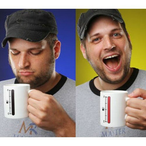 Полоска с рисками нанесена специальной термокраской, которая имеет свойство менять цвет с чёрного на красный под воздействием температуры. То есть, пока ваша кружка пуста или заполнена чем-то холодным, полоска остаётся мрачного чёрного цвета, но стоит лишь налить в неё горячего чая или кофе, как цвет изменится на жизнерадостный красный! Что интересно, полоска поменяет цвет точно до уровня горячей жидкости: половина горячего напитка в чашке - половина же полоски будет красной, а половина останется чёрной. Сможете следить за уровнем :)